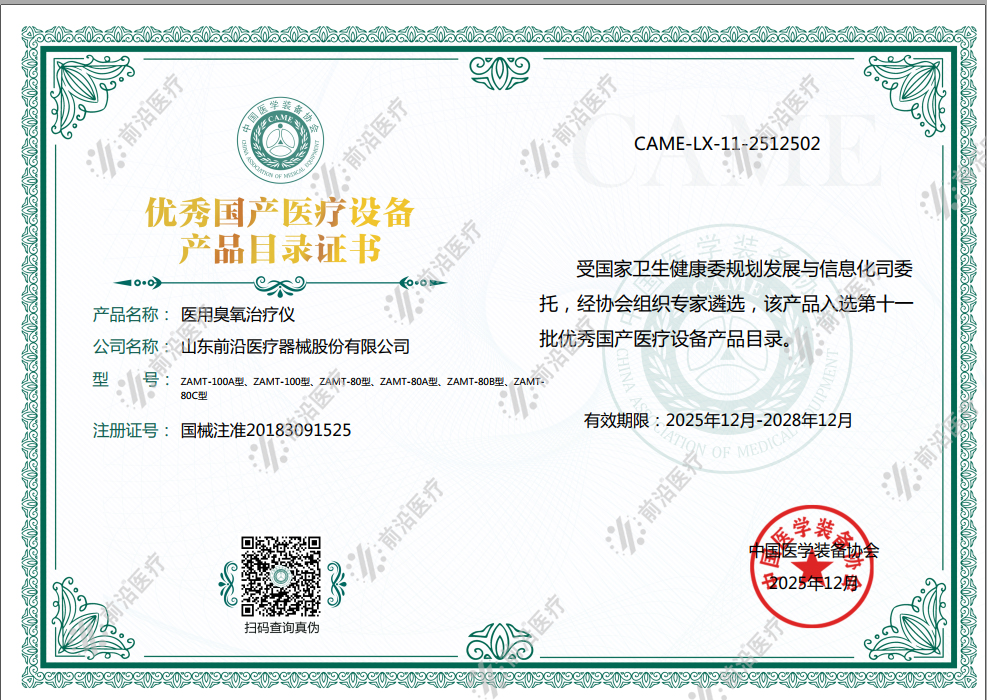 祝賀前沿醫(yī)療6款醫(yī)用臭氧治療儀,成功入選中國醫(yī)學裝備協(xié)會評選的第十一批優(yōu)秀國產醫(yī)療設備名單!這是繼2020年11月,公司研發(fā)生產的內熱式針灸治療儀入選《第九批優(yōu)...